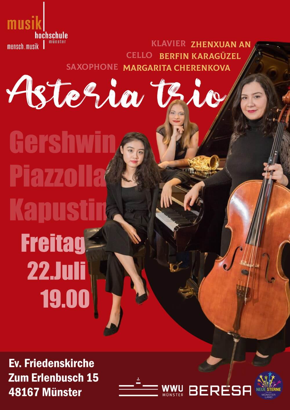 Die Musikerinnen haben sich als Studentinnen der Musikhochschule Münster kennengelernt und dort 2019 ihr neuartiges Trio gegründet. Auftritte führten sie bereits nach Köln und Aachen. Sie präsentieren ihr aktuelles Programm im Rahmen des Projekts „Neue Sterne für das Münsterland“. Zum Repertoire des Asteria Trios gehören Komponisten des 20. Jahrhunderts mit Werken, die sich oft an der Grenze bewegen von klassischer Musik und Jazz.