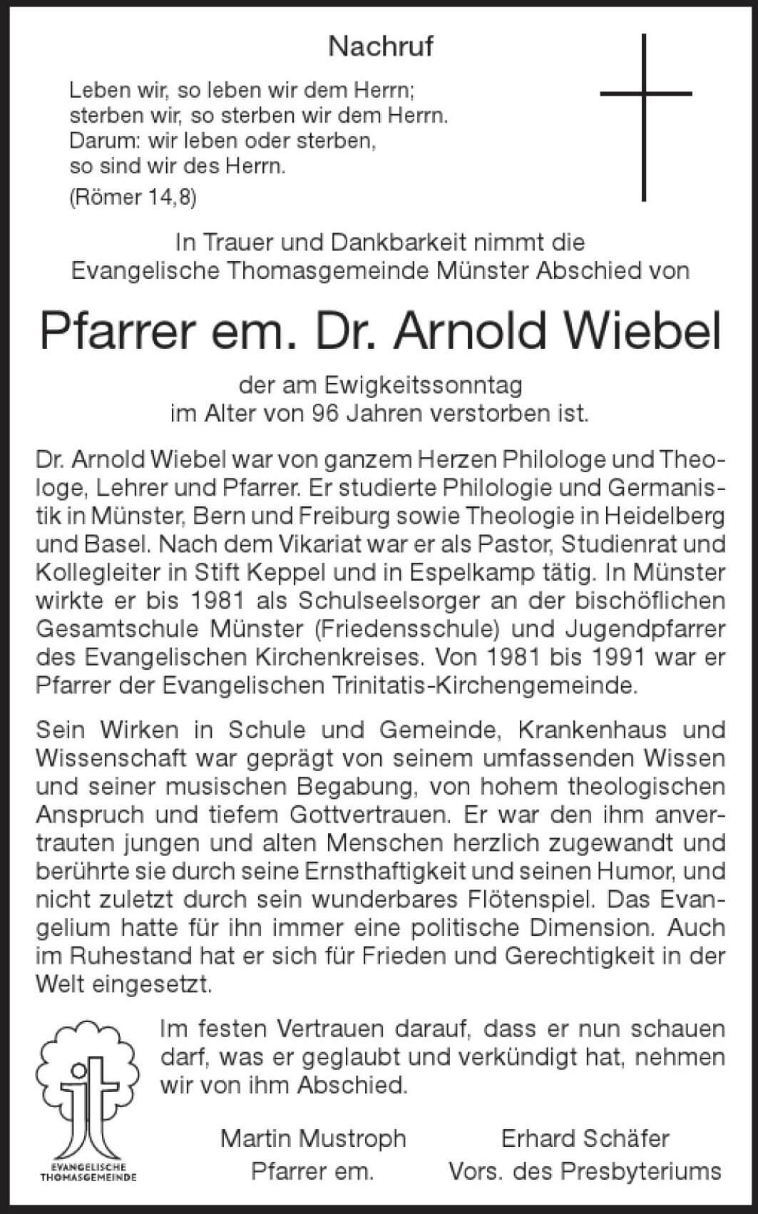 In Trauer und Dankbarkeit nimmt die Evangelische Thomasgemeinde Münster Abschied von Pfarrer em. Dr. Arnold Wiebel, der am Ewigkeitssonntag im Alter von 96 Jahren verstorben ist.