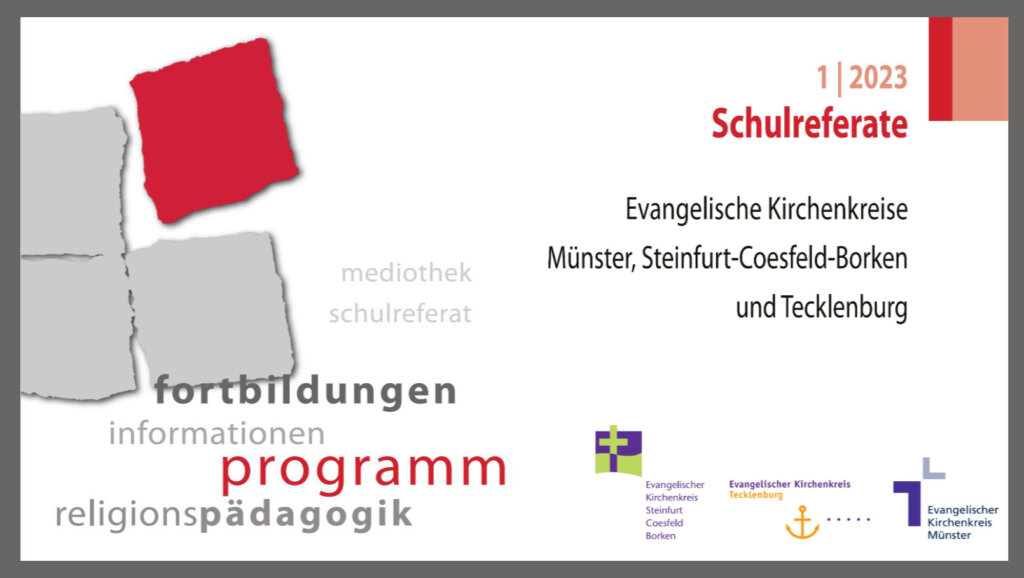 Münsterland. Das neue Programm der Schulreferate der Evangelischen Kirchenkreise Münster, Steinfurt-Coesfeld-Borken und Tecklenburg ist erschienen. Die beiden Schulreferenten Pfarrer Thorsten Jacobi von den Evangelischen Kirchenkreisen Steinfurt-Coesfeld-Borken und Tecklenburg und Pfarrer Ralf Fischer vom Evangelischen Kirchenkreis Münster haben verschiedene Angebote für das erste Halbjahr 2023 zusammengestellt und freuen sich auf Begegnungen, Austausch und interessante Gespräche zu aktuellen Themen. In Fortbildungen möchten sie gemeinsam mit den Teilnehmenden nach neuen Wegen für den Religionsunterricht suchen, Erfahrungen austauschen und miteinander neue Impulse bekommen.