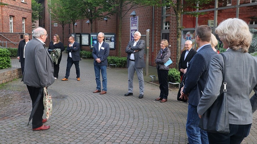 Bevor der Dankabend bei einem leckeren Essen, Wein und Gesprächen ausklang, hatte Pfarrer Thorsten Melchert einen informativen Stadtrundgang zu drei besonderen Orten organisiert, an denen sich Menschen mit der Frage beschäftigen, wie Leben verantwortlich für- und miteinander gestaltet werden kann. Angelika Pes von der Bürgerstiftung Unser Leohaus gab Einblicke in das rege bürgerliche Engagement vor Ort. Den nächsten Haltepunkt bildete die katholische Kirche St.Vitus. Angelika Westrup, aktiv bei Maria 2.0, gab einen sehr persönlichen Einblick, warum es ihr wichtig ist, in einer Kirche zu bleiben, in der vieles gerade alles anders als gut läuft: Um in gemeinsamer Verantwortung zeitgemäß und transparent Glauben und Gemeinschaft leben und gestalten zu können und so etwas zu verändern. Den Abschlusspunkt des Rundgangs bildete das Ev. Familienzentrum Arche Noah. Leiterin Damaris Bartels stellte den energieeinsparenden Erweiterungsneubau vor, der durch eine Kooperation von Stadt und Kirchengemeinde möglich wurde.