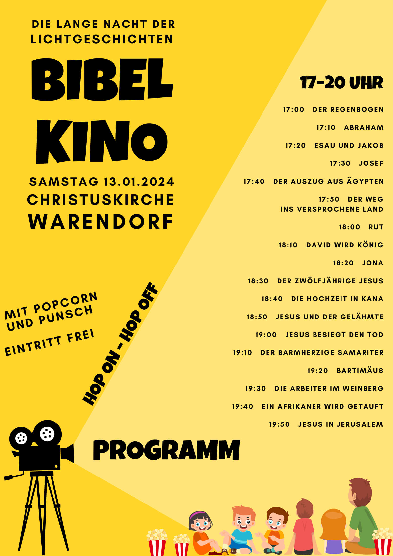 „Bei einer Langen Nacht der Lichtgeschichten zeigen wir den Schatz. Zusammen mit den Kindern gehen wir auf Entdeckungsreise durch die Bibel. Wir haben insgesamt 17 Geschichten aus dem Alten und dem Neuen Testament dabei. Damit veranstalten wir für Kinder zwischen 4 und 10 Jahren ein Bibelkino – mitten in der Kirche!” Das Team um Martha Nooke wird an dem Abend erzählen, was Menschen aus der Bibel mit Gott erlebt haben. Nebenbei klackert und rauscht stilecht ein alter Lichtprojektor, wenn die Dia-Bilder durchrutschen. “In den Kissen vorm Altarraum ist es sicher sehr gemütlich und am Eingang gibt es Popcorn und Punsch für zwischendurch.“