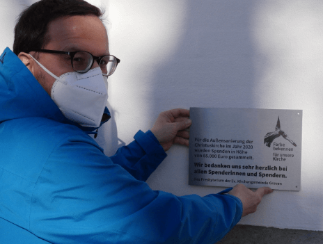 Ursprünglich sollte die Tafel 2020 während einer Dankveranstaltung der Gemeinde vor den Augen der Spenderinnen und Spender montiert werden. Aus Gründen des Infektionsschutzes musste die Einladung zweimal verschoben werden, zuletzt auf einen noch nicht festgesetzten Termin in 2021. „Die Tafel soll aber jetzt schon unseren Dank zeigen – denn ohne die fantastische Unterstützung vieler Bürger*innen und Mitglieder der Gemeinde wäre die Christuskirche jetzt nicht strahlend weiß, sondern weiterhin dreckig und grau,“ erklärt Frau Neyer aus der Gemeindeleitung. „Ich freue mich schon auf die Zeit nach dem Lockdown, wenn wir wieder Gottesdienste feiern können und unsere Besucherinnen und Besucher die Tafel an der Kirche aus nächster Nähe sehen.“