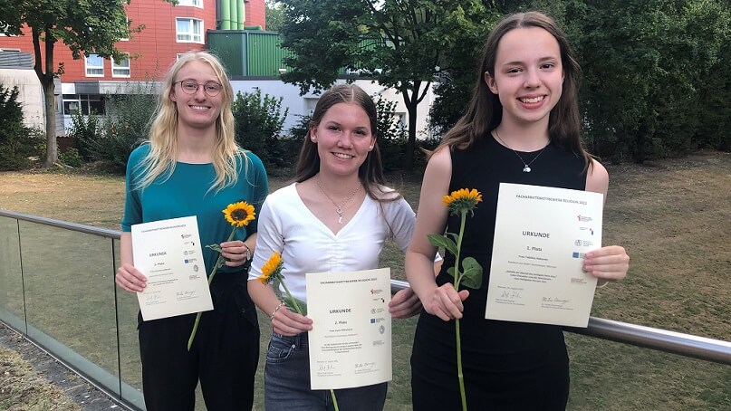 Die Siegerinnen des Facharbeitswettbewerbs Religion 2022: (v. l.): Antonia Laubrock (3. Platz, Gymnasium St. Michael Ahlen), Liane Wiesmann (2. Platz, Collegium Johanneum Loburg Ostbevern) und Tabitha Hakenes (1. Platz, Kardinal von Galen-Gymnasium Münster-Hiltrup). Bild: Bischöfliche Pressestelle/Jule Geppert