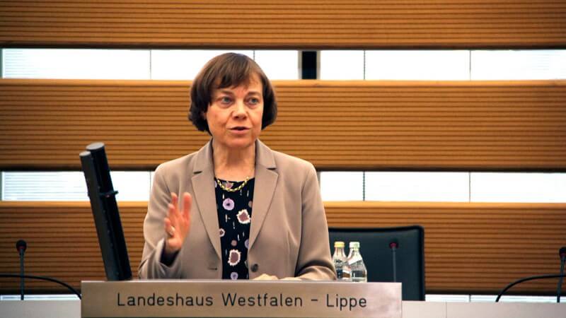 „Wir müssen aussteigen aus der Logik, die nur verlieren und gewinnen kennt“, betonte Präses Dr. h.c. Annette Kurschus in ihrem Vortrag im LWL-Landeshaus in Münster. Foto: EKvW/Scharenberg.