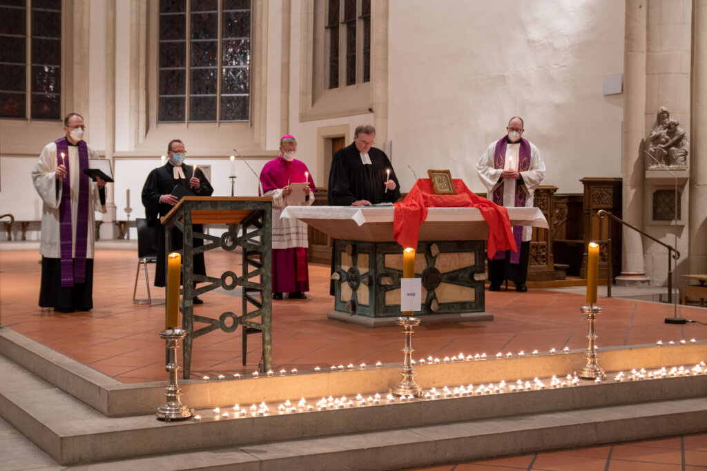 Feierten zusammen mit 200 Teilnehmenden ein ökumenisches Friedensgebet: (von links) Stadtdechant Jörg Hagemann, Superintendent Holger Erdmann, Weihbischof Dr. Stefan Zekorn, Pfarrer Friedrich Stahlhut (ACK) und Pfarrer André Sühling (ACK). Foto: Bischöfliche Pressestelle/Ann-Christin Ladermann