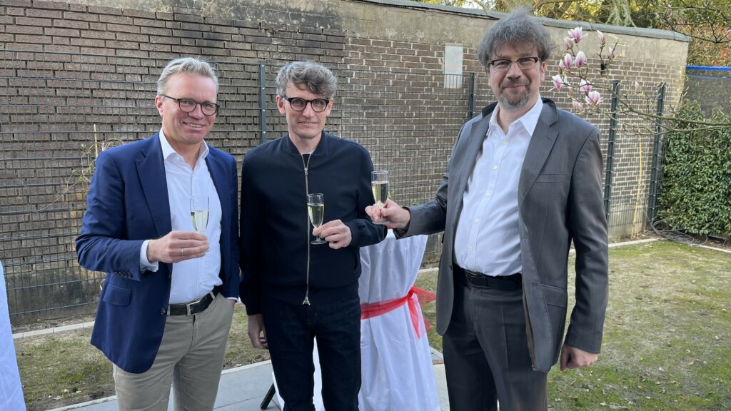 Investor Thomas Vennemann, Innenarchitekt Christian Pohl und Pfarrer Andreas Hirschberg freuen sich über die Fertigstellung. Foto: Evang. Kirchenkreis Münster.