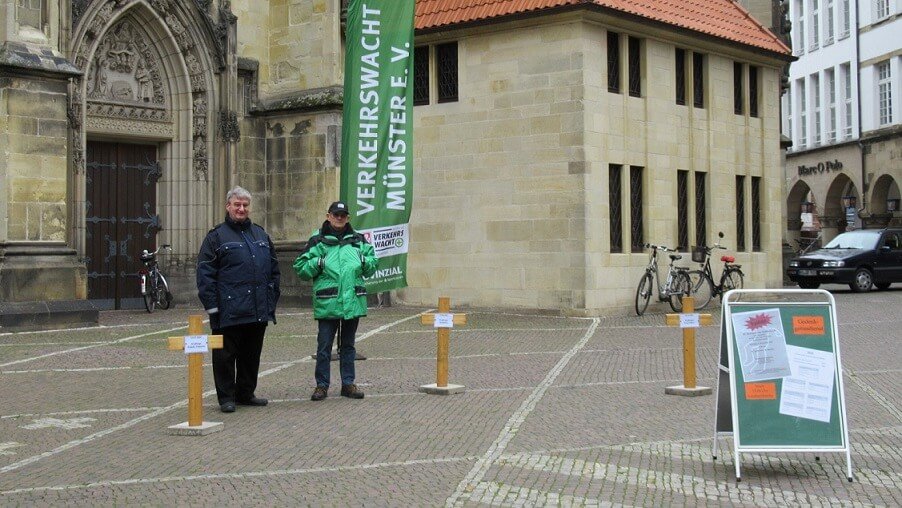 Drei Holzkreuze vor der St. Lambertikirche, aufgebaut von der Verkehrswacht Münster, erinnerten an die drei Verkehrstoten des vergangenen Jahres. Foto: Verkehrswacht MS
