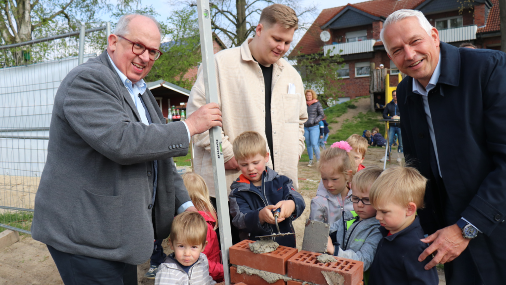 Zwischen Pfarrer Thorsten Melchert und Bürgermeister Wilhelm Sendermann wirkten die Kinder tatkräftig am Bau mit. Foto: Antje Pflips.