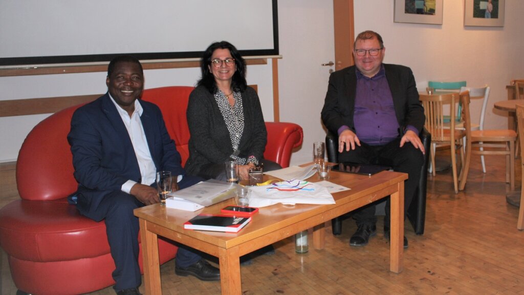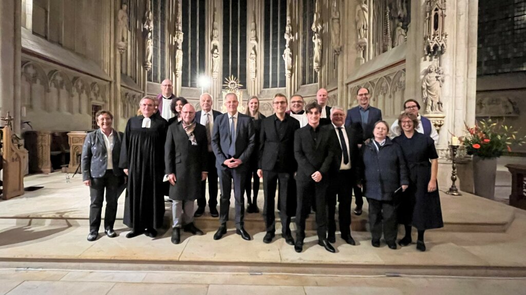 Bezirksbürgemeister Benedikt Spangenberg (v.l.), Dr. Brigitte Hornstein, Pfarrer Sacha Sommershof, Fördervereinsvorsitzende der Gemeinde Petra Schnell, Pastoral Referent Hans-Dieter Sauer, Leiterin der Bezirksverwaltung in Münster-Ost Cornelia Schnell bei der Ausstellungseröffnung in Gemeindehaus an der Zionskirche. Foto: Eva Maria Landmesser
